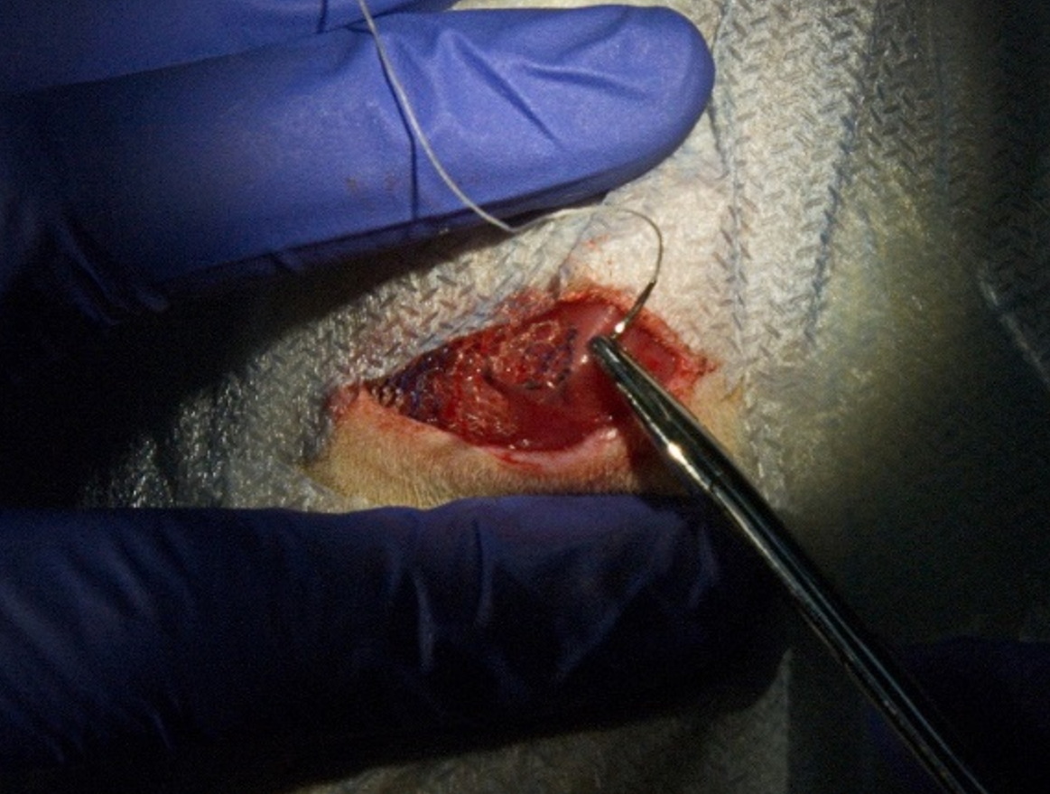 С целью исключения возможности выгрызть швы и сетчатый протез исследуемым животным имплантация выполнялась в область холки и спины, в слой между гиподермой и поверхностной фасцией (слой аналогичный передней брюшной стенке при методике onlay extraperitoneal).