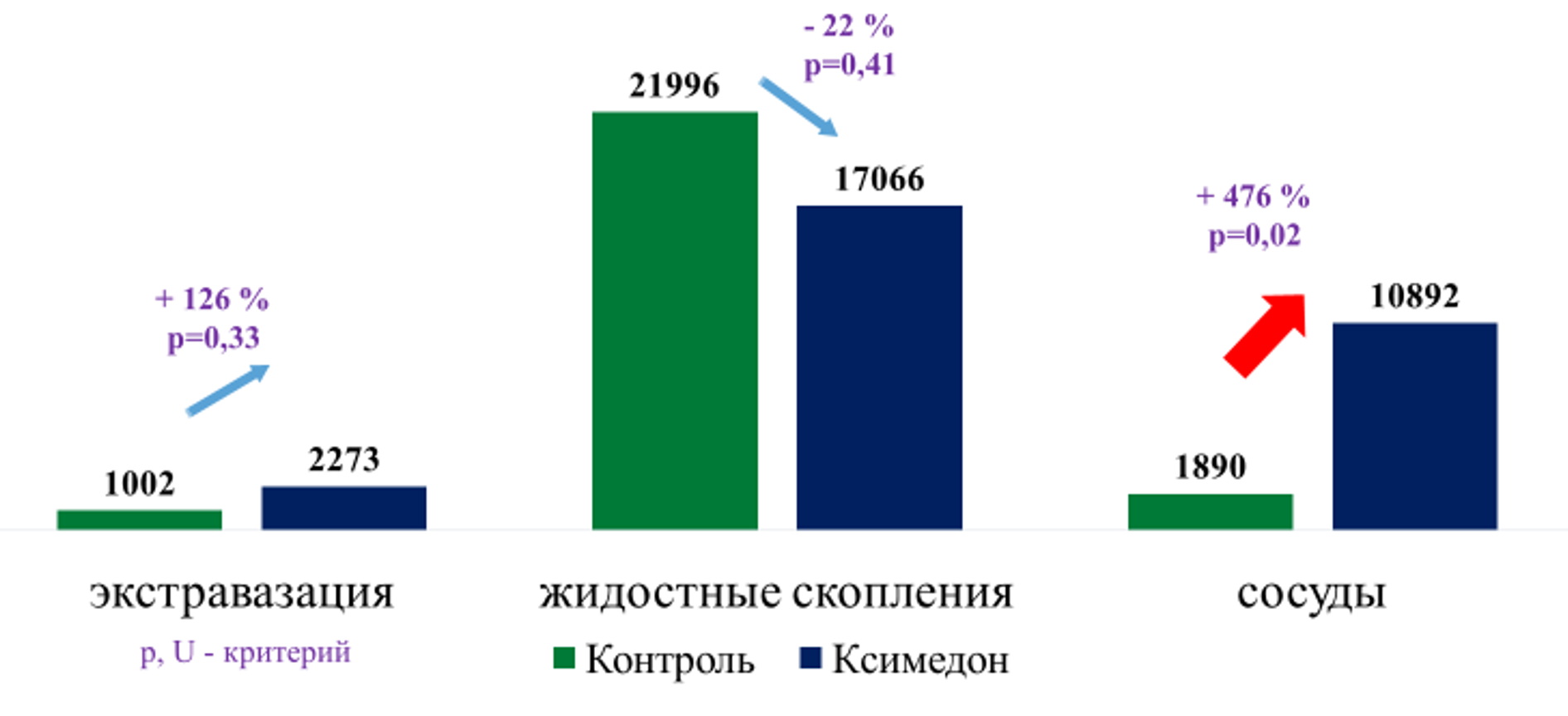 По результатам гистоморфометрии (рис. 3), в группе животных, получавших ксимедон, площадь сосудов в опыте, превышала аналогичную в контроле почти в 6 раз (p=0,02; U-критерий). Площади экстравазаций (p=0,33; U-критерий) и жидкостных скоплений (p=0,41; U-критерий) значимых отличий, по сравнению с контролем, не имели, вероятно, по причине недостаточности материала.