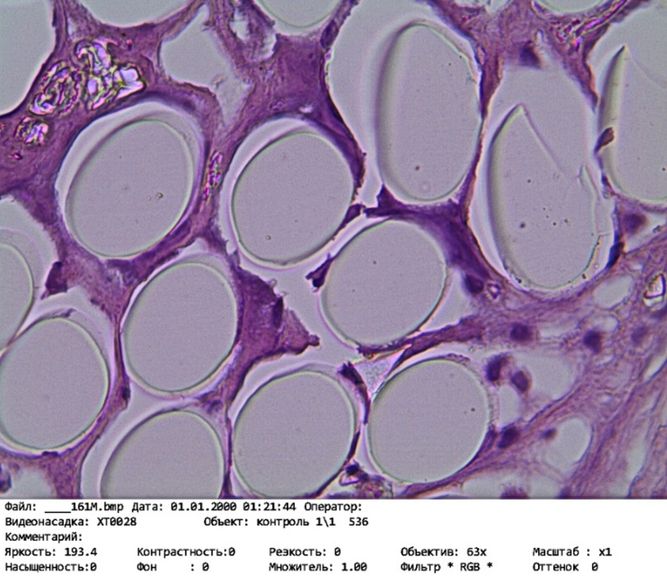 Рис. 4. Микрофото области имплантации в контрольной группе, 5 сутки после операции (гематоксилин-эозин, μVizo-103) увеличение х630.