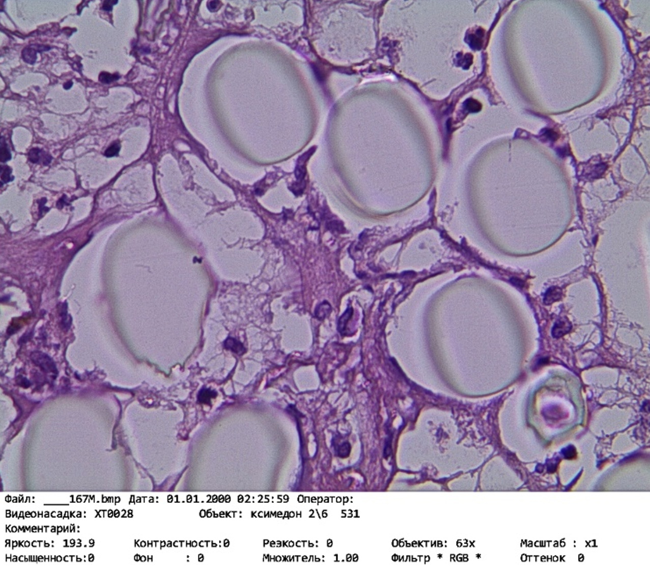 Рис. 5. Микрофото области имплантации в основной группе, 5 сутки после операции (гематоксилин-эозин, μVizo-103, увеличение х630).