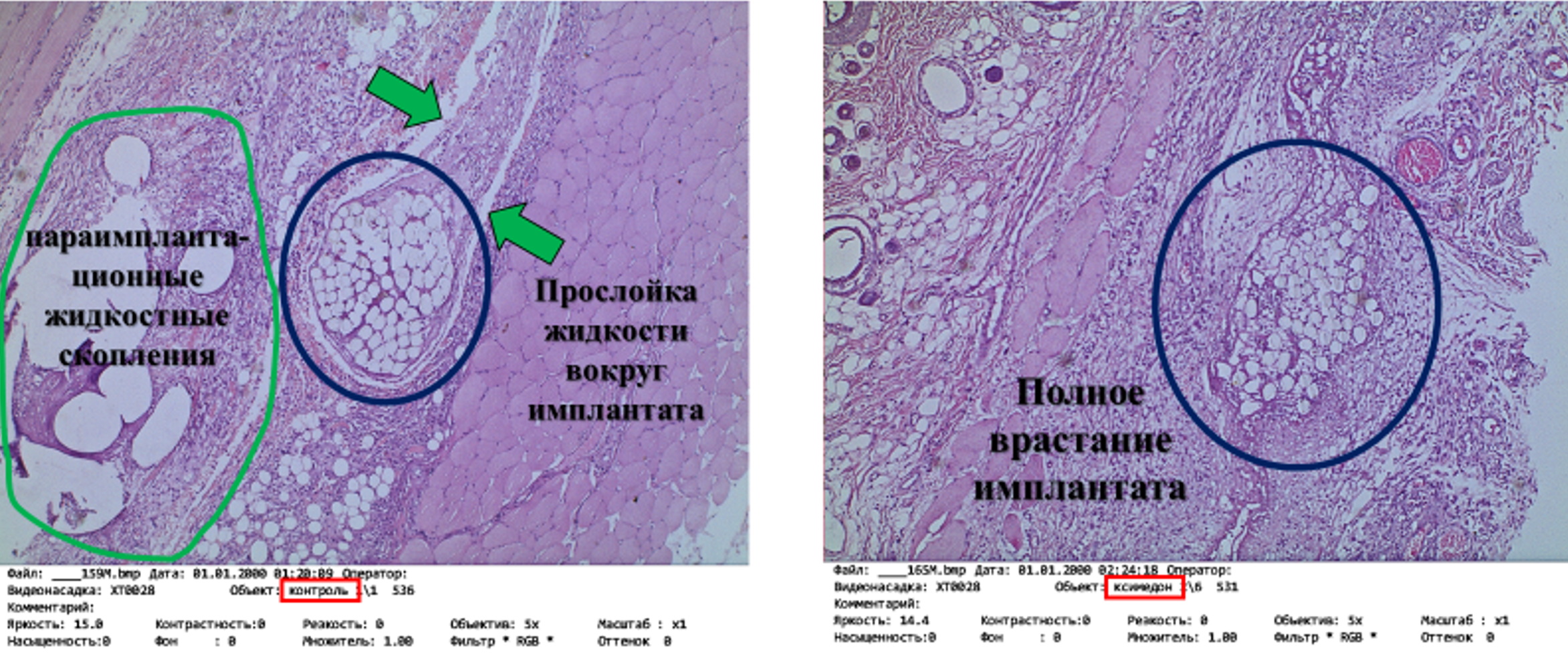 Макроскопически в ряде препаратов в группе «Ксимедон» вокруг протеза отмечали петехии, однако формирования гематом, не происходило. Протез на 5 сутки во всех случаях плотно фиксировался к окружающим тканям.