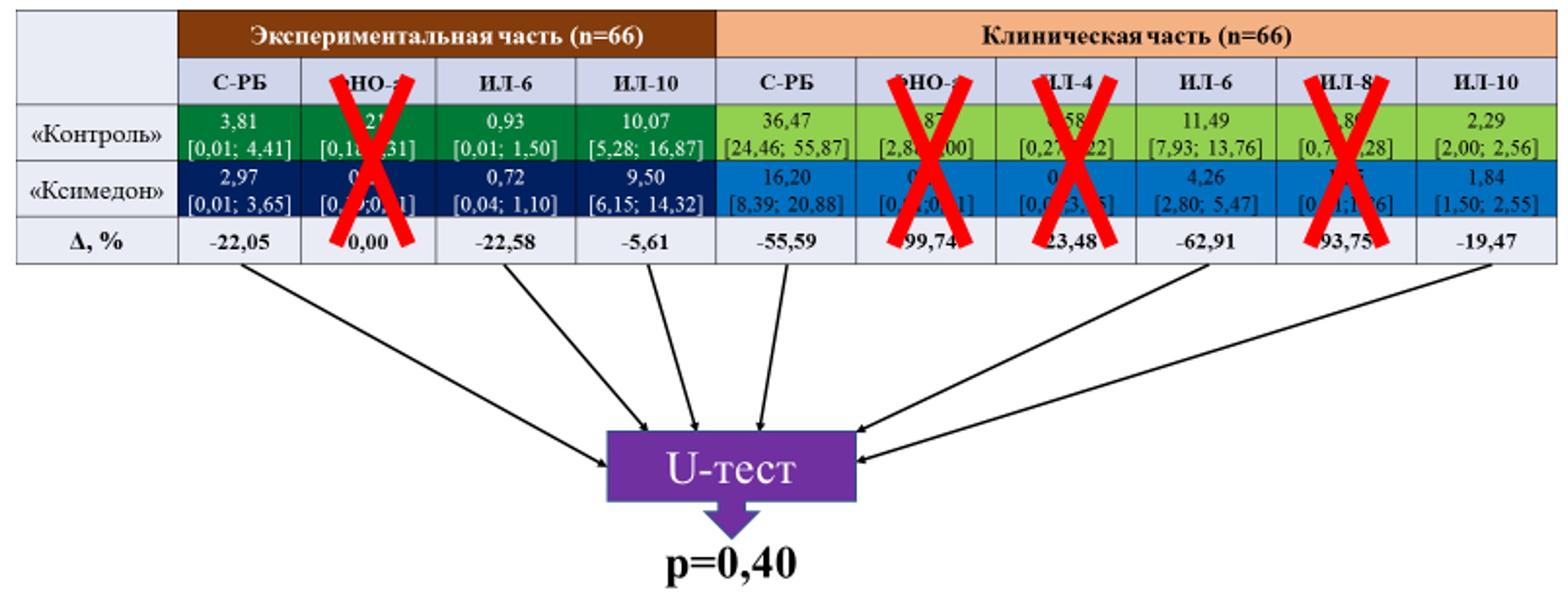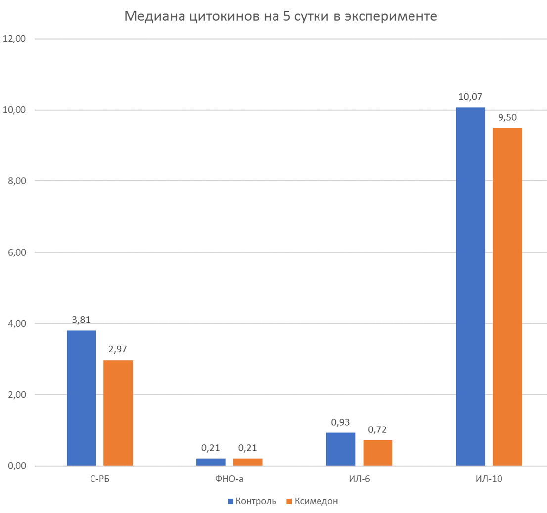 Обсуждение результатов. Ксимедон оказывает значимое влияние на увеличение площади сосудов области имплантации в эксперименте. Его применение ассоциировано с более низким показателем C-реактивного белка и ИЛ-6 крови на 5 сутки в эксперименте по сравнению с контролем. Ксимедон оказывает значимое влияние на концентрацию цитокинов крови в клиническом исследовании: C-реактивный белок, ФНО-а, интерлейкины 6, 8 и 10. Динамика C-реактивного белка, 6 и 10 интерлейкинов крови в экспериментальном исследовании значимо не отличается от клинического. В клиническом исследовании приём ксимедона ассоциирован с меньшим количеством послеоперационных осложнений.
