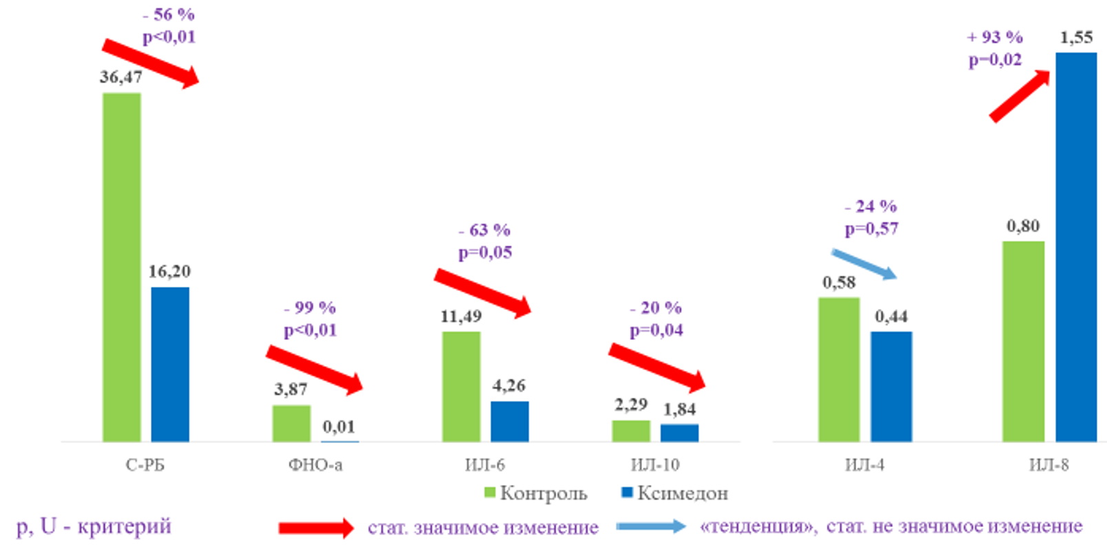 При изучении цитокинового профиля пациентов (рис. 8) установлено, что в группе «Ксимедон» отмечается значимое снижение концентрации С-РБ (p<0,01; U-критерий), ФНО-а (p<0,01; U-критерий), ИЛ-6 (p=0,05; U-критерий), ИЛ-10 (p=0,04; U-критерий) и значимое повышение ИЛ-8 (p=0,02; U-критерий).