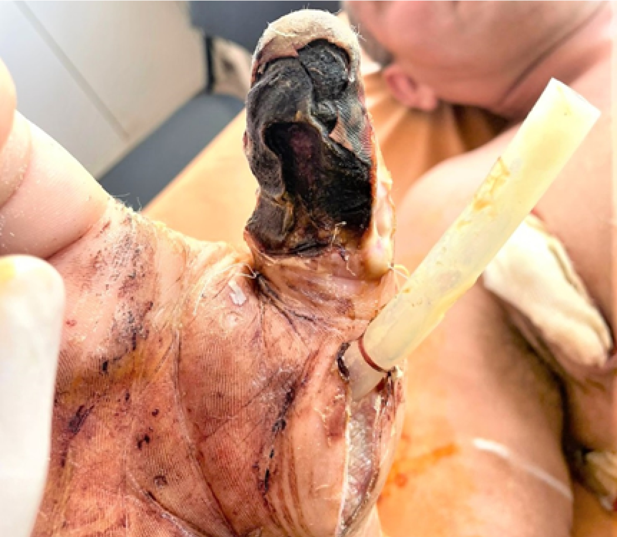 При поступлении больного состояние средней тяжести, возбуждён, настаивает на оказании экстренной помощи. Пульс 84 удара в минуту, АД 130/80 мм рт. ст., со стороны внутренних органов патологических отклонений нет. Правая кисть резко отёчна, гиперемирована, болезненна при пальпации. На ногтевой фаланге первого пальца рваная рана, размерами 3,0*1,0 см, из которой выделяется мутное содержимое. Кожа и подкожная клетчатка вокруг раны черного цвета. На предплечье и плече по ходу лимфатических сосудов имеется полоса гиперемии кожи. В правой подмышечной области пальпируется конгломерат лимфатических узлов. При рентгенографии кисти костных изменений не выявлено. В анализах крови отмечено повышение количества лейкоцитов до 11×10³ мкл со сдвигом до 27% палочкоядерных нейтрофилов. В биохимических анализах крови показатели функции печени и почек находятся на верхних границах нормы, выраженное увеличение С-реактивного белка – до 332,8 мг/л. Анализ мочи без патологических изменений.