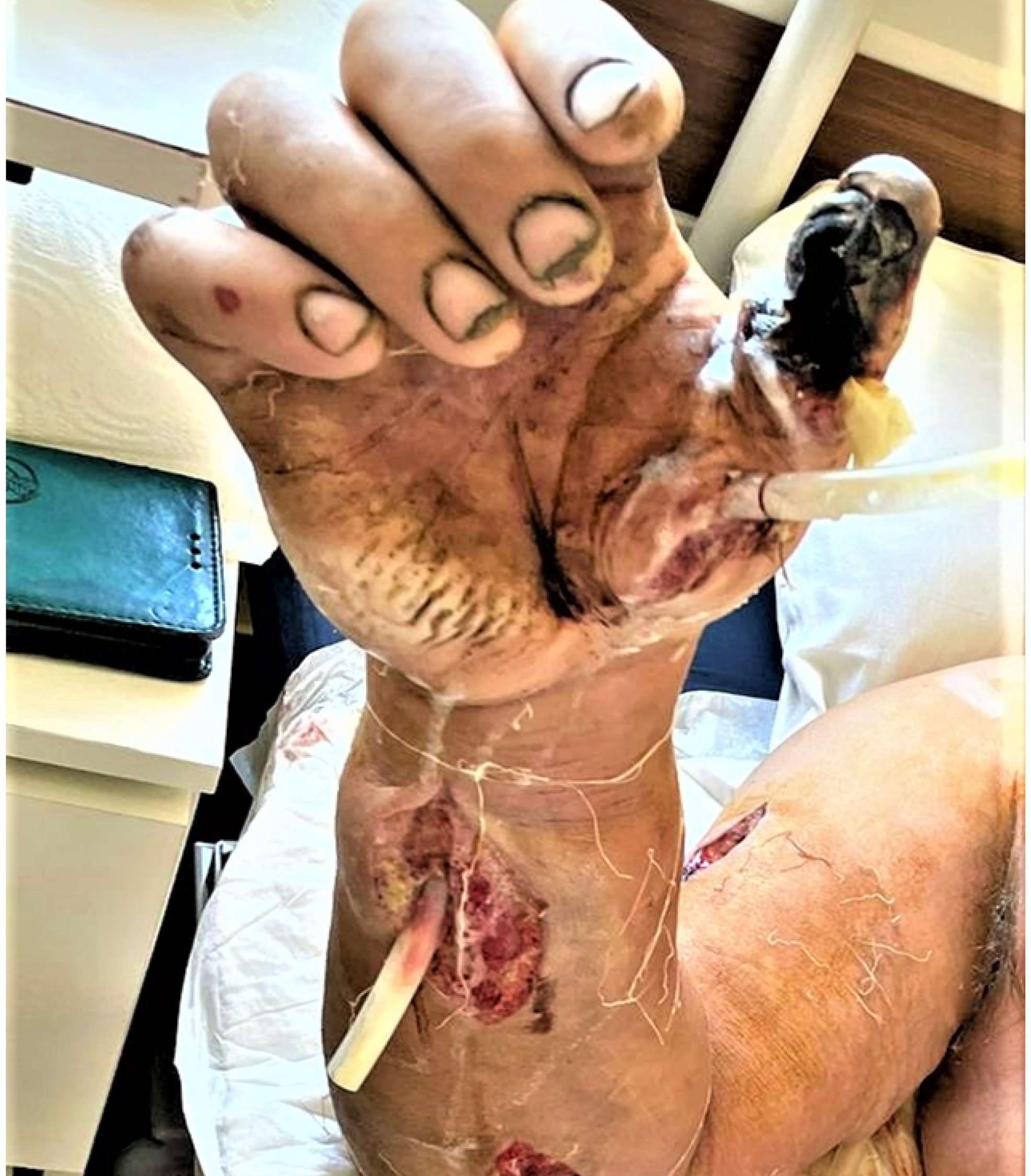 06.06.2022 года под внутривенным обезболиванием произведена операция: этапная некрэктомия. Иссечены некротизированные ткани во всех операционных ранах. Больной переведён из реанимационного отделения в отделение гнойной хирургической инфекции. Продолжена антибактериальная, дезинтоксикационная и антикоагулянтная терапия.