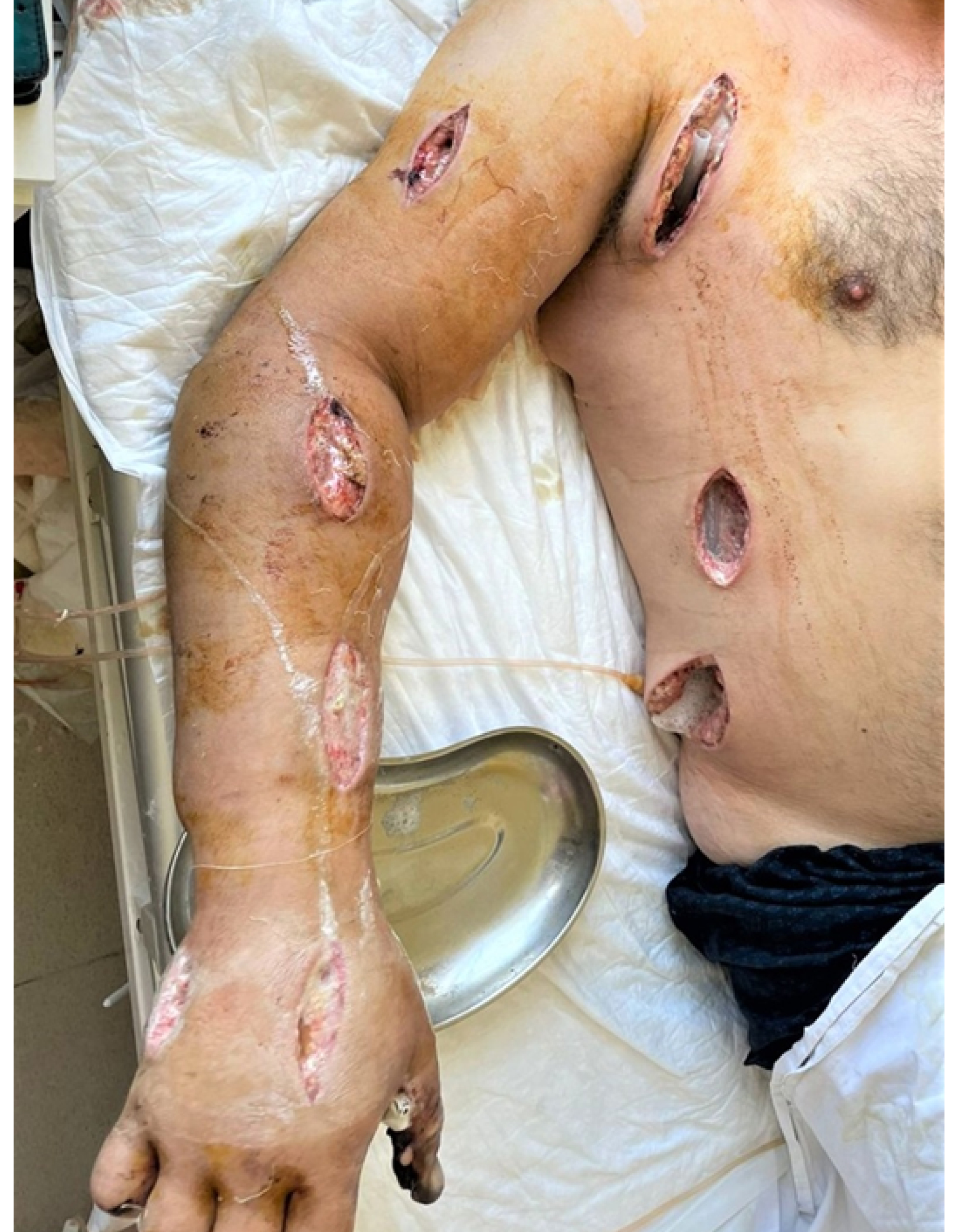 02.06.2022 года, через 12 часов после первой операции, выполнено повторное хирургическое вмешательство. На тыле правой кисти произведены два параллельных разреза, вскрыты фасциальные пространства. Некротические участки кожи и подкожной жировой клетчатки, поверхностной фасции иссечены. В ранах кисти, выполненных во время первой операции, произведено иссечение некротизированных тканей. В дистальной части правого предплечья по локтевому и лучевому краям произведены два разреза длиной до 6 см, вскрыто пространство Пирогова. Выделилось до 20 мл жидкого гноя, некротические участки мягких тканей иссечены. В проксимальной части правого предплечья выполнены два аналогичных разреза. Отделяемое из ран мутное, поверхностная фасция с участками некроза иссечена. По латеральной и медиальной поверхностях в средней трети правого плеча произведены 2 разреза длиной 6 см, вскрыта фасция и проведена ревизия межмышечных пространств. Мягкие ткани отёчны, отделяемое серозное, мышечная ткань жизнеспособна. Все послеоперационные раны на кисти, предплечье и плече дренированы (рис. 2).
