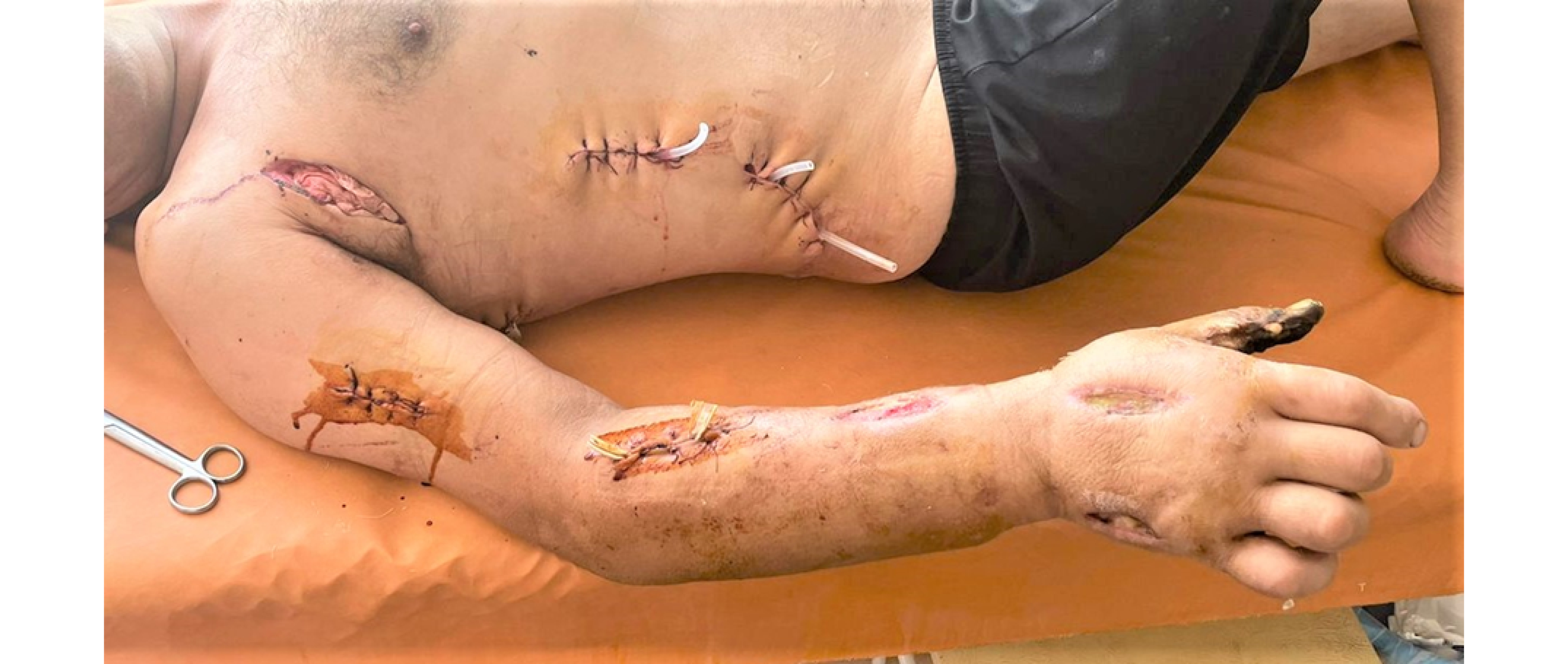 16.06.2022 года, через 2 недели после первых 3-х операций, произведена пластика операционных ран, которые очистились от некротизированных тканей, на плече, груди и животе местными тканями (рис. 4).