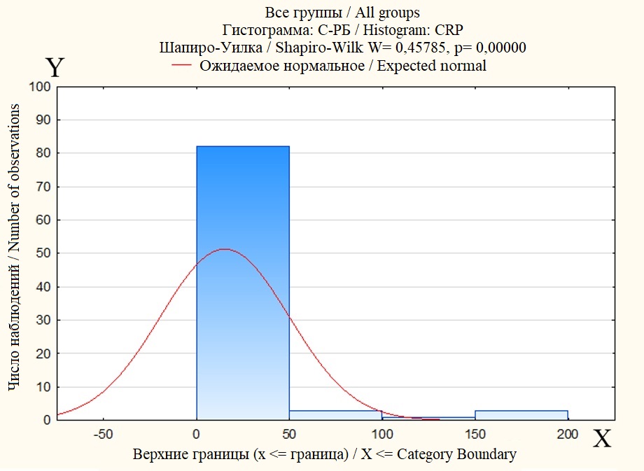 Рис. 1. Нормальность распределения по Шапиро-Уилку (по оси X – концентрация С-РБ плазмы крови, по оси Y – количество пациентов с той или иной концентрацией С-РБ плазмы крови).