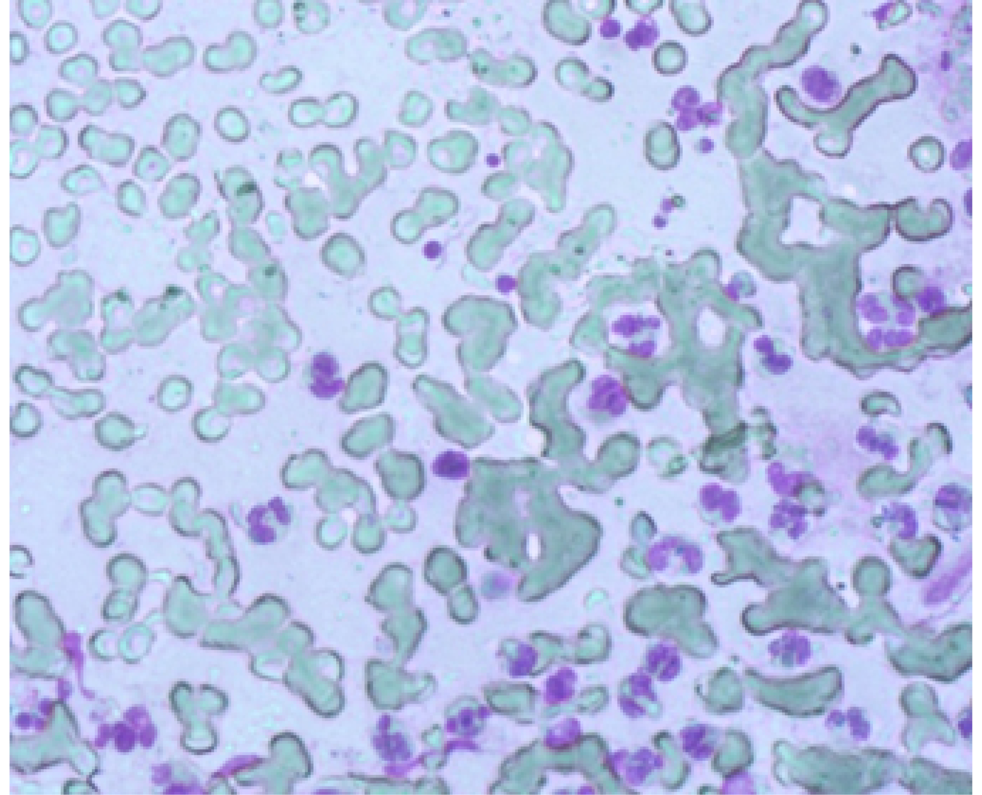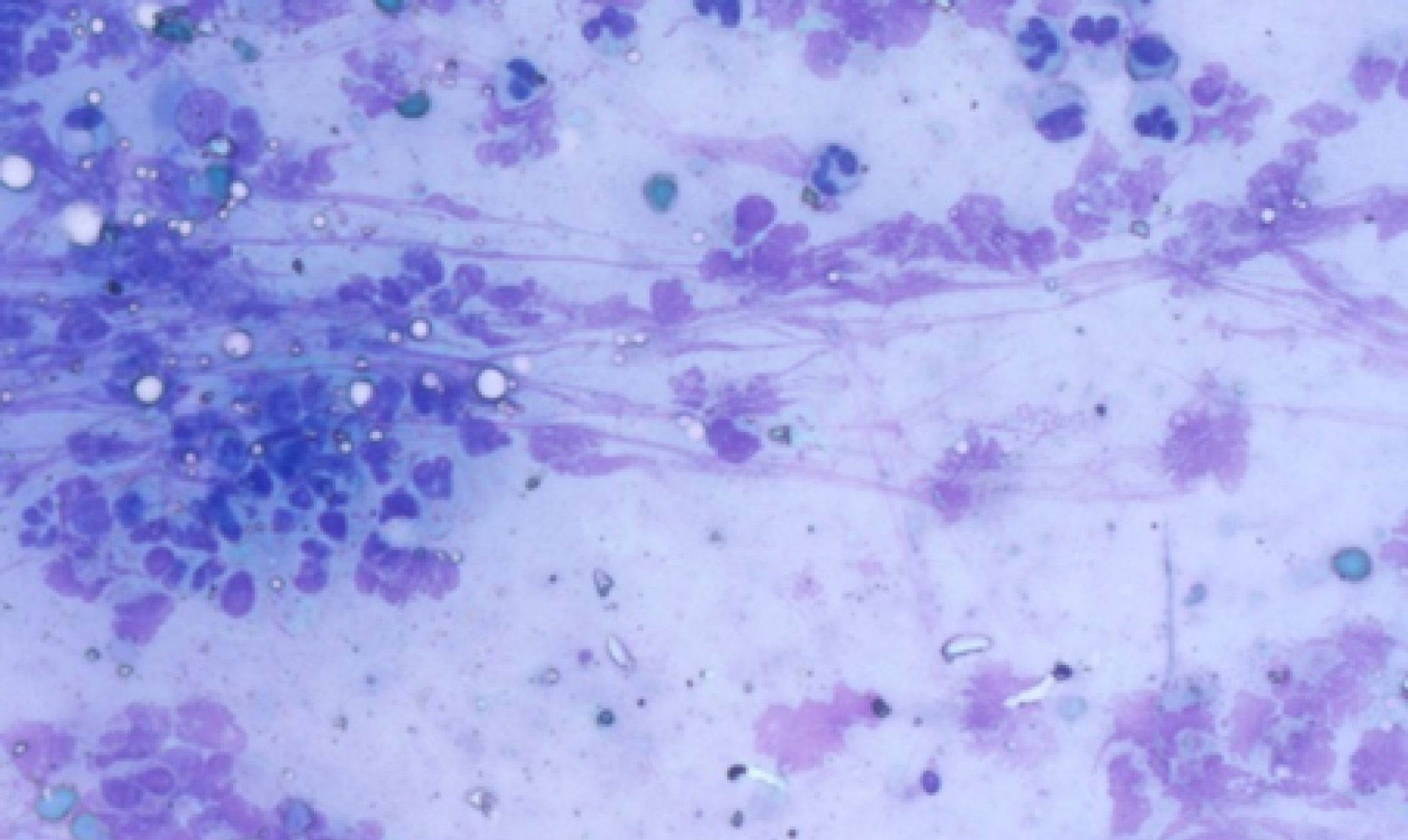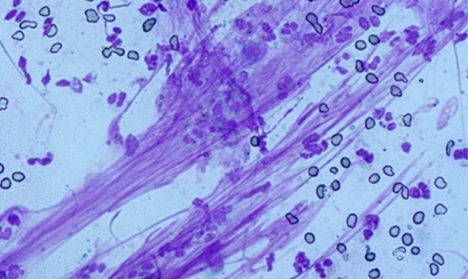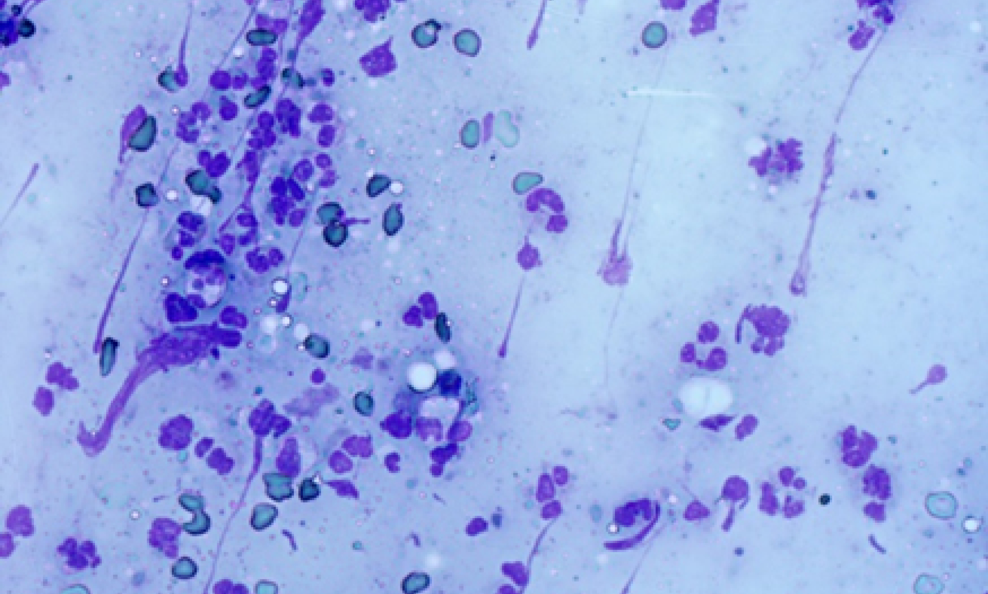 Рис. 6. Фрагмент цитограммы мазка с поверхности раны на 5-е сутки, основная группа. Среди нейтрофилов и полибластов обнаружены фиброциты, фибробласты, фиброзные волокна. Окраска по Романовскому-Гимзе. Увеличение × 400.