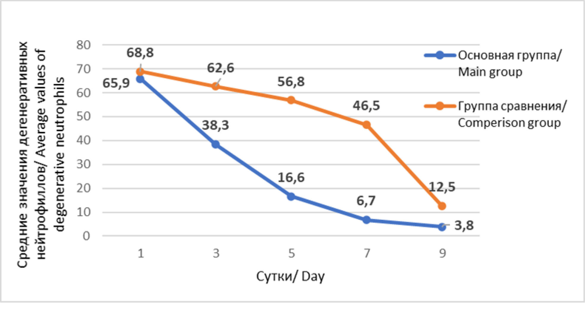 Fig. 2. Dynamics of average values of degenerative neutrophils in cytograms of both study groups in patients with soft tissue phlegmon.