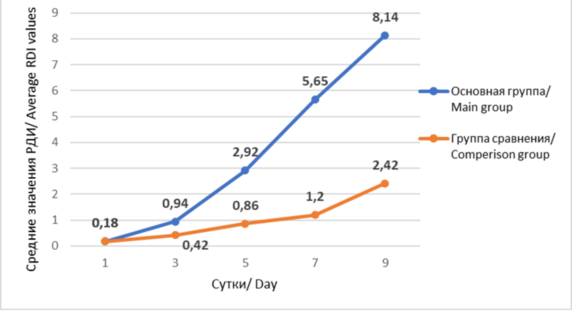 По результатам расчета дисперсионного анализа с повторными измерениями для обеих групп были доказаны статистически значимые изменения клеточного состава в цитограммах на 1-е и 9-е сутки послеоперационного периода. В основной группе наблюдали более быстрое снижение количества ДН, которые на 9-е сутки составили 3,8 ± 0,3%, в отличие от группы сравнения - 12,5 ± 0,4%. Также отмечали более быстрое повышение РДИ в основной группе - на 9-е сутки значения РДИ составили 8,2 ± 0,1, в отличии от группы сравнения (2,4 ± 0,1). Такая динамика клеточных реакций свидетельствовала о более интенсивных процессах очищения гнойной полости и более активном фагоцитозе у больных основной группы. Динамика средних значений дегенеративных нейтрофилов и значений РДИ в цитологических мазках у больных с флегмонами мягких тканей, в группах исследования представлены на рисунках 2, 3.