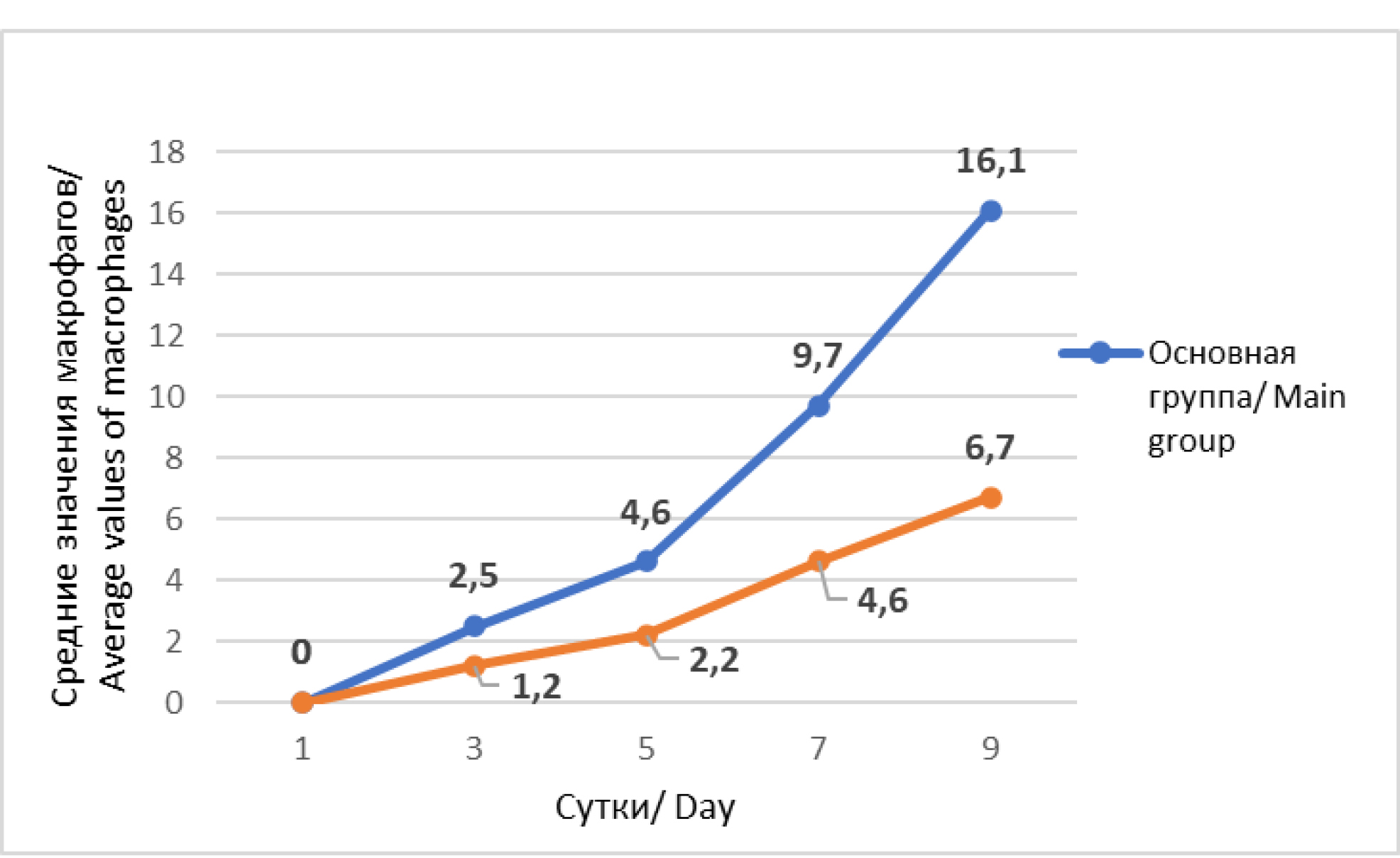 Fig. 4. Dynamics of average values of macrophages in cytograms in study groups in patients with soft tissue phlegmon.