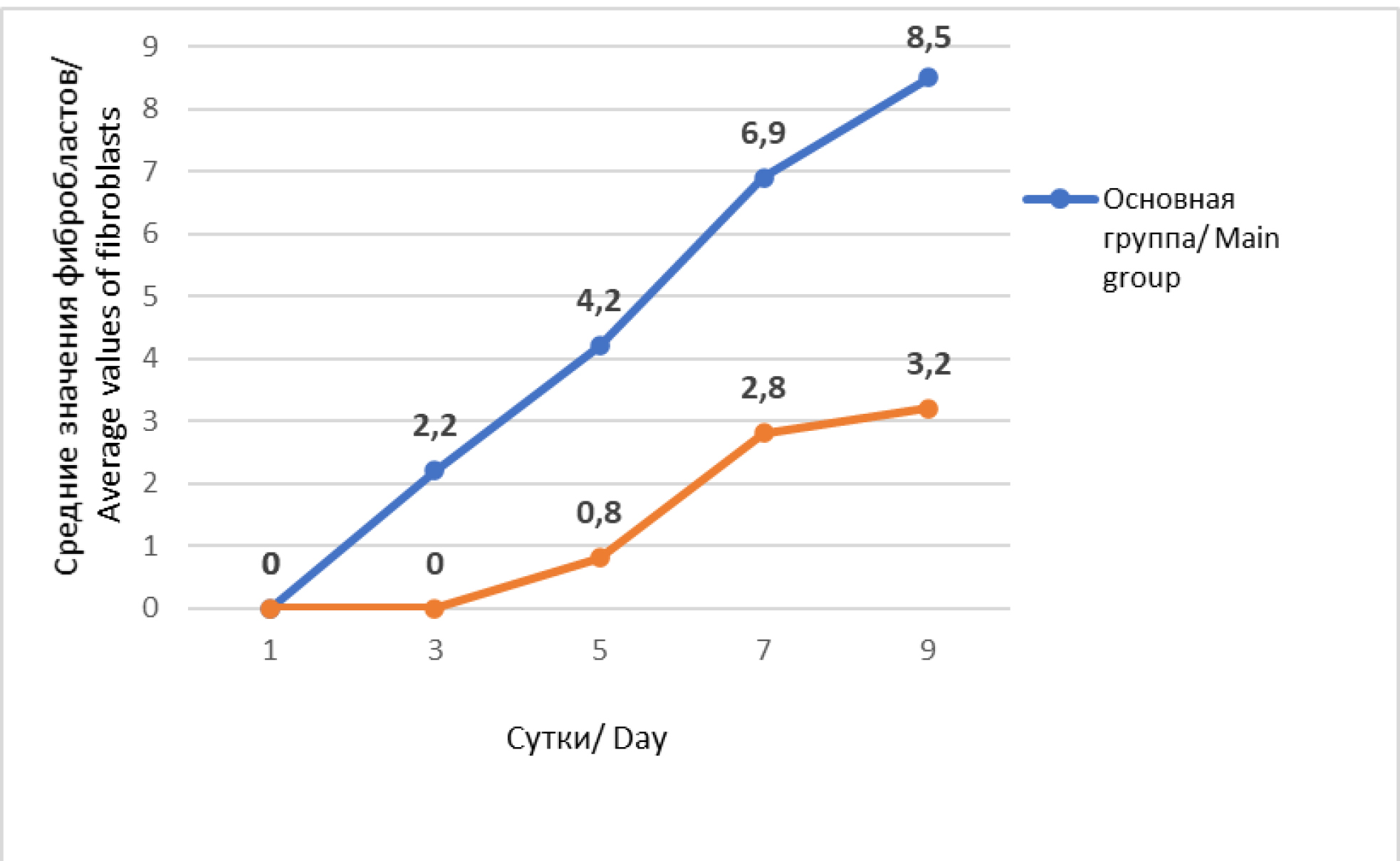 Fig. 5. Dynamics of mean values of fibroblasts in cytograms in study groups in patients with soft tissue phlegmon.