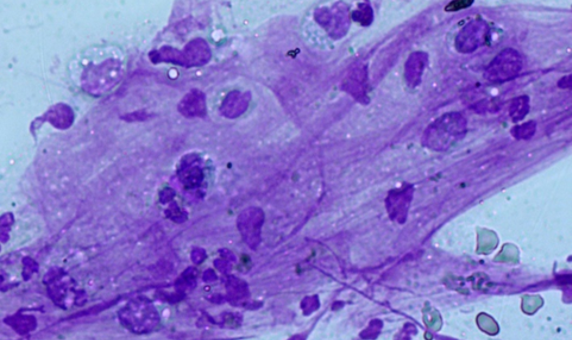 В основной группе на 9-е сутки после операции цитологическая картина соответствовала регенеративному типу клеточных реакций: снижено общее количество нейтрофильных лейкоцитов, преобладали их сохранные формы, отмечено отсутствие микрофлоры. Клеточные элементы представлены преимущественно дифференцированными клетками (профибробластами, фибробластами), которые находились среди волокон промежуточного вещества. Эпителиальные клетки располагались в виде характерных клеточных пластов.