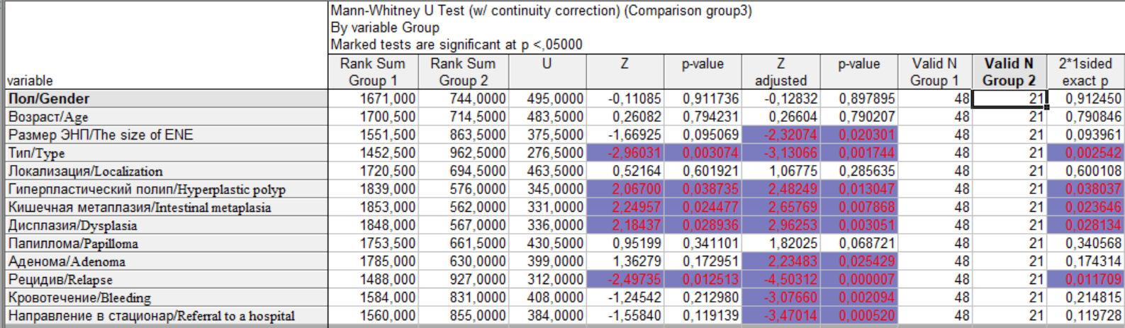 Fig. 4. The results of the evaluation of differences between two independent samples according to the Mann-Whitney criterion in Statistica 12 Stat Soft, Inc.