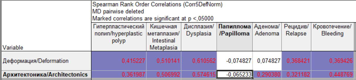 Анализируя взаимосвязи между эндоскопическими показателями и данными морфологических исследований (табл. 2) можно сделать вывод о том, что все коэффициенты корреляции, за исключением связи деформации микроструктуры слизистой оболочки и субэпителиальной ангиоархитектоники с папилломой, статистически значимы (p<0,05);