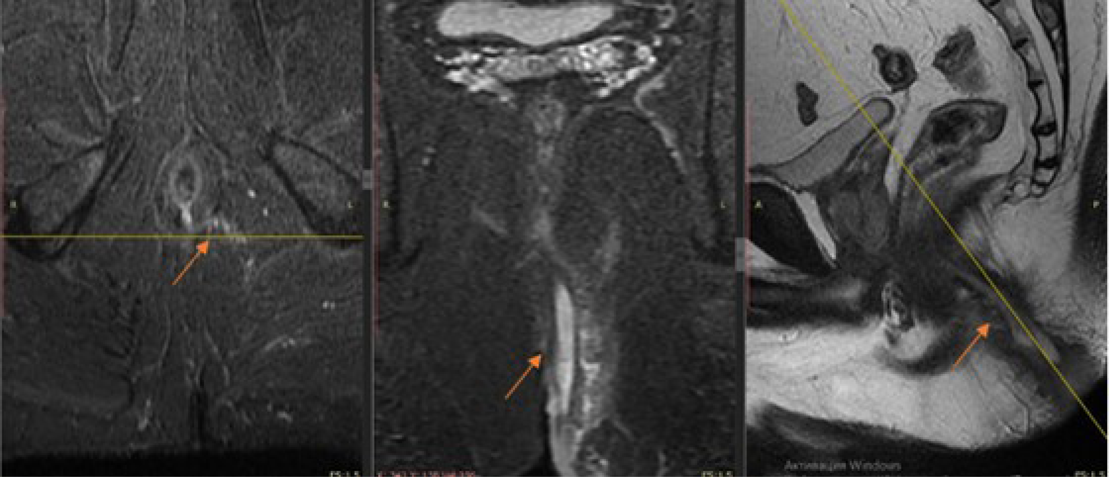 При исследовании выполнялись импульсные последовательности с использованием малой толщины среза (3 мм) и уменьшенного поля обзора (FOV), в косо-аксиальной и косо-корональной плоскостях, что позволило улучшить визуализацию архитектоники свищей по отношению к замыкательному аппарату прямой кишки.