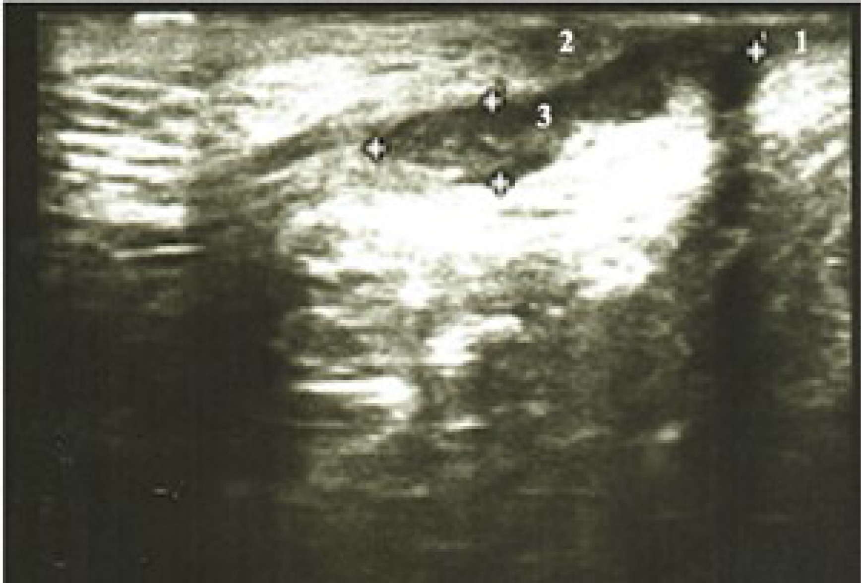 Рис. 2. Пациент В., 43 лет. Эхограмма заднего транссфинктерного свища заднего прохода, захватывающего более 30% сфинктера. 1 – внутренний сфинктер, 2 – наружный сфинктер, 3 – свищевой ход.